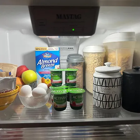 A fully furnished kitchen consists of a fridge, oven, and a cooktop. Guests can dine at Panda Express located in proximity to the Santa Fe villa.